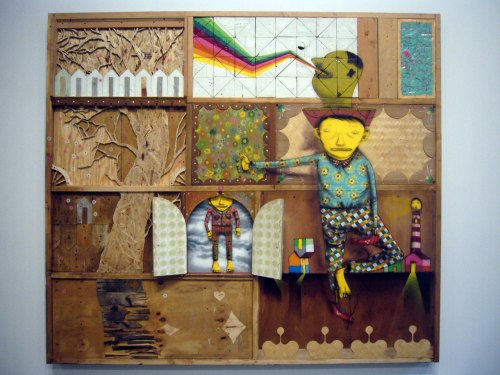 Swimming Sisters of Switchback Sea. Hand painted block painted block print on wood with found objects. Swoon. 2008