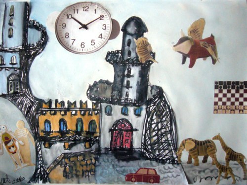 The Fortress of Lost Time. Graphite on paper and magazine cutouts. December 27, 2010. Miti and Gianni Aiello.