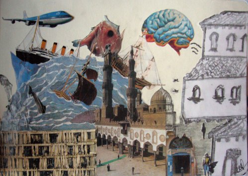 Ink on tracing paper. Kuwait, January 2010. The scene at the bottom is what I saw-or decided to see- at The Avenues, the most popular malla in Kuwait City. There is nothing like seeing photography and drawings from a trip abroad to make you realize all reality is subjective, and we choose to see what we want to. We just don’t realize it in our own backyard.Paintings & Collages