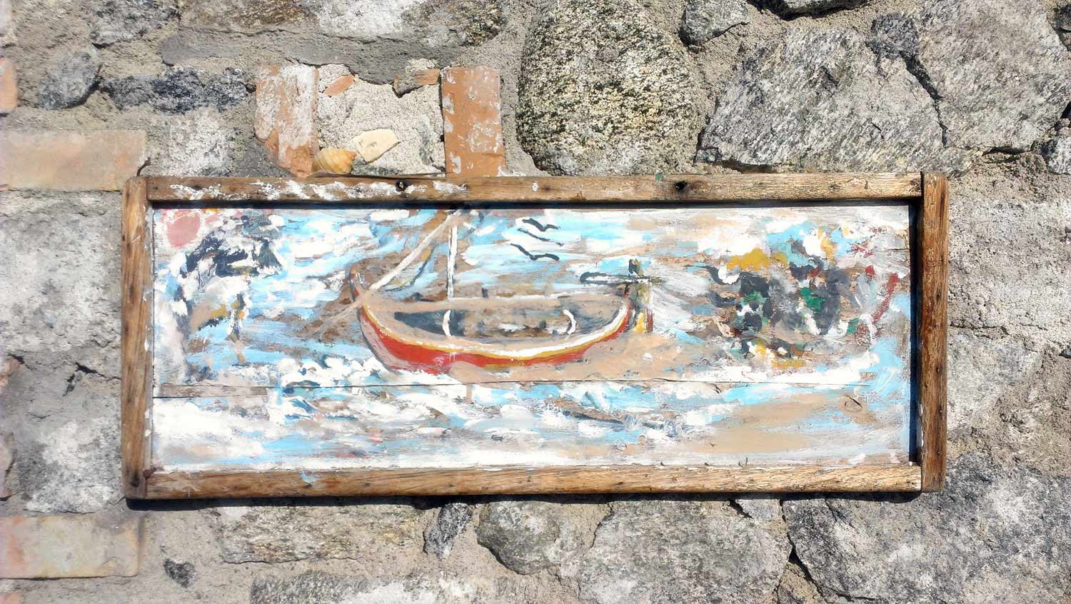 Throughout it all, my dad is drawing boats, boats and fish, boats and fish and fishermen (my grandfather used to do the same on the edge of the newspaper). He is carving boats out of olive wood, making miniature fishing boats, and painting boats. He is constantly making or repairing stuff: cleaning and mending the nets, repairing the motor of his WWII Jeep ‘the Americans left’ , or adding to his living art installation, the fishing shack, or Baracca, of which I shared glimpses here (as it was) , here and here, and that stops tourists in their tracks. He is adding hand carved kitchen utensils for the house on the hill, or scavenging old farmhouses for vintage furniture, when he is not working on his fishing boat, Elena.