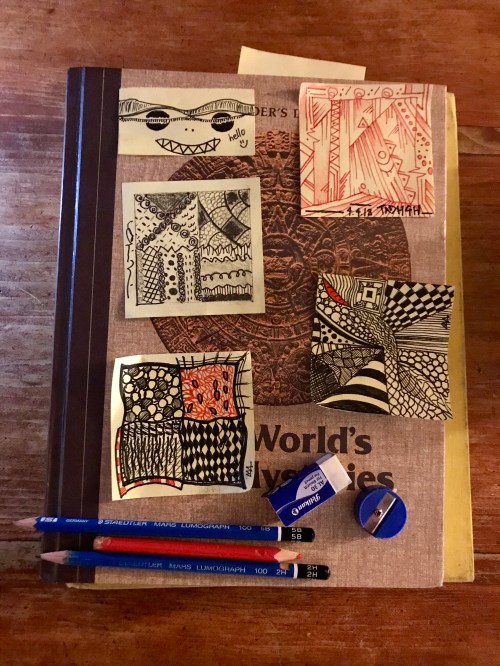I also (re)discovered the zentangle technique and it has been fun to conduct a little tangle class with my friends –they call it “yoga for the mind” or meditation in action. I find it very freeing and love, as with collage, not knowing the outcome.
