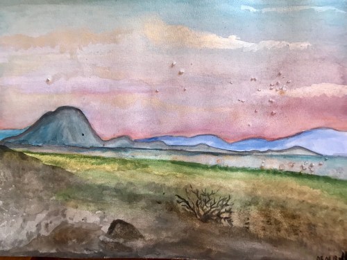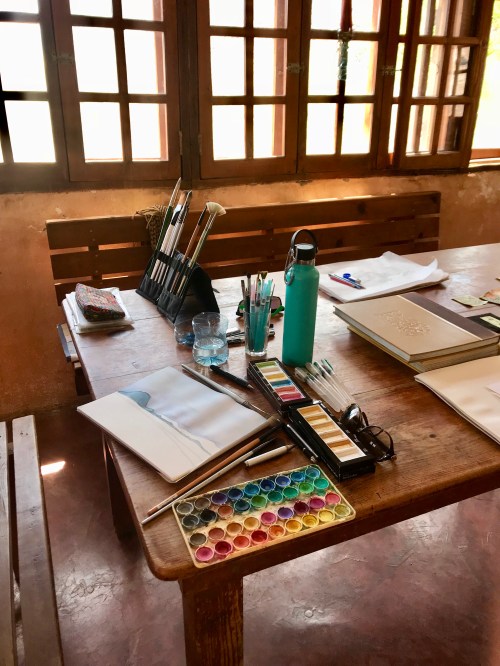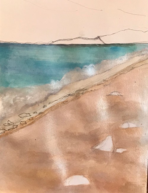 One of the guests i met at Mauro’s Posada, my Baja California home, had watercolor paper with him (!) so the water/sand beach scene shows a bit more promise. Still learning/ playing with watercolor techniques…