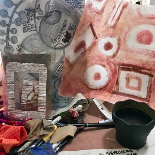 Today’s workshop involved learning foundations and advanced tools for making an art/visual journal. I learned countless new ways of using acrylic matte medium along with pastel, plaster of Paris, Golden high flow acrylic, distress stain and different papers/ glazing uses to achieve translucent effects.
