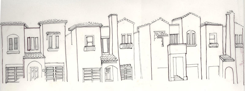 The sketches/drawings above were done during a tour of Downtown San Diego.  I found out that, even using plain copier paper the results obtained are fairly good, and, what was even more exciting, once I made color copies of my renderings, the results looked really polished and professional. Nevertheless, I am posting here the originals rendering to show the process. I actually like the rough quality of the results, but I cannot help but wonder what kind of fantastic effects one could obtain by manipulating these images in Photoshop and turning them into photocollages. I found out that the most successful photocollages are those done starting with solid, traditional work, whether in original, scanned or photocopied form.  Ah! The possibilities!