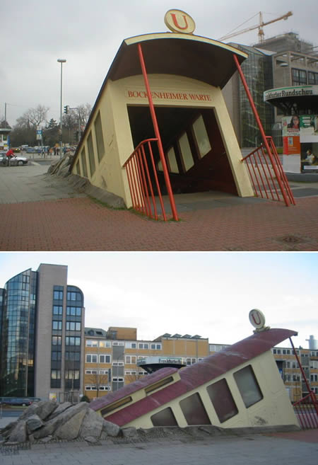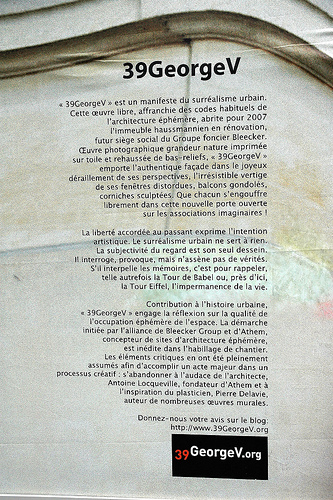 "39GeorgeV" is an urban surrealism manifesto. It sheltered the renovation of an Hausmannian building in Paris, during year 2007. It's a life-size photographic work based on the original building, printed on canvas, enhanced with bas-relief.