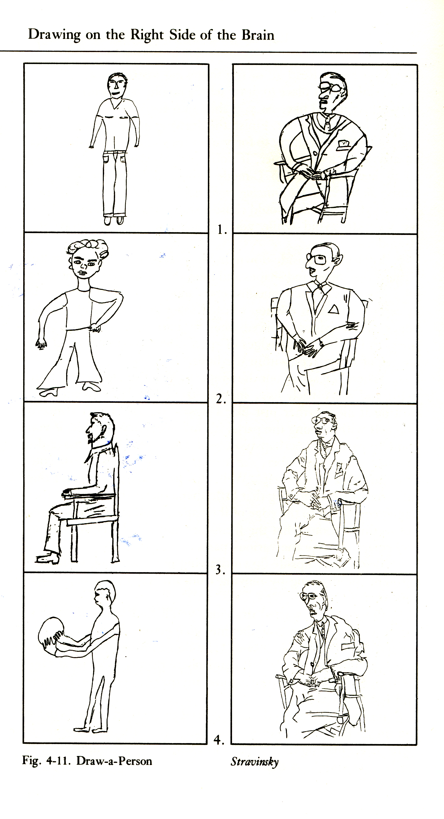 Look at the drawings on the right-hand side of Figure 4-11. Studens 1 and 2 copied Picasso’s drawing right side up. As you can see, their drawings did not improve, and they use the same stereotypic, symbolic forms in their copies of the Picasso Stravinsky as they used in their Draw-a-Person drawings. In the drawings done by Student 2, you can see the confusion caused by the foreshortened chair and Stravinsky crossed legs.