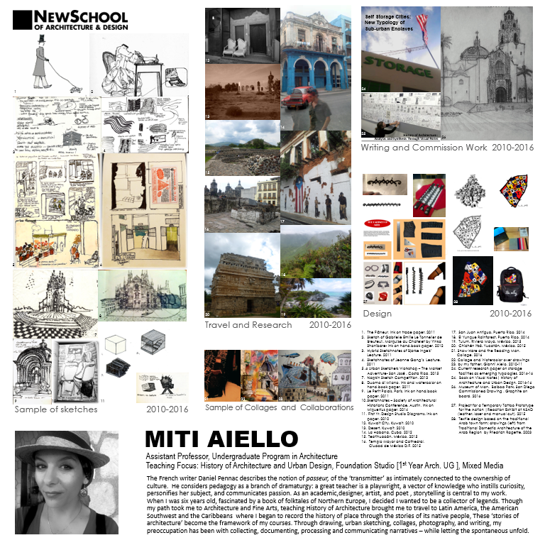 When I was six years old, fascinated by a book of folktales of Northern Europe, I decided I wanted to be a collector of legends. Though my path took me to Architecture and Fine Arts, teaching History of Architecture brought me to travel to Latin America, the American Southwest and the Caribbeans  where I began to record the history of place through the stories of its native people, These ‘stories of architecture’ become the framework of my courses. Through drawing, urban sketching, collages, photography, and writing, my preoccupation has been with collecting, documenting, processing and communicating narratives – while letting the spontaneous unfold.”
