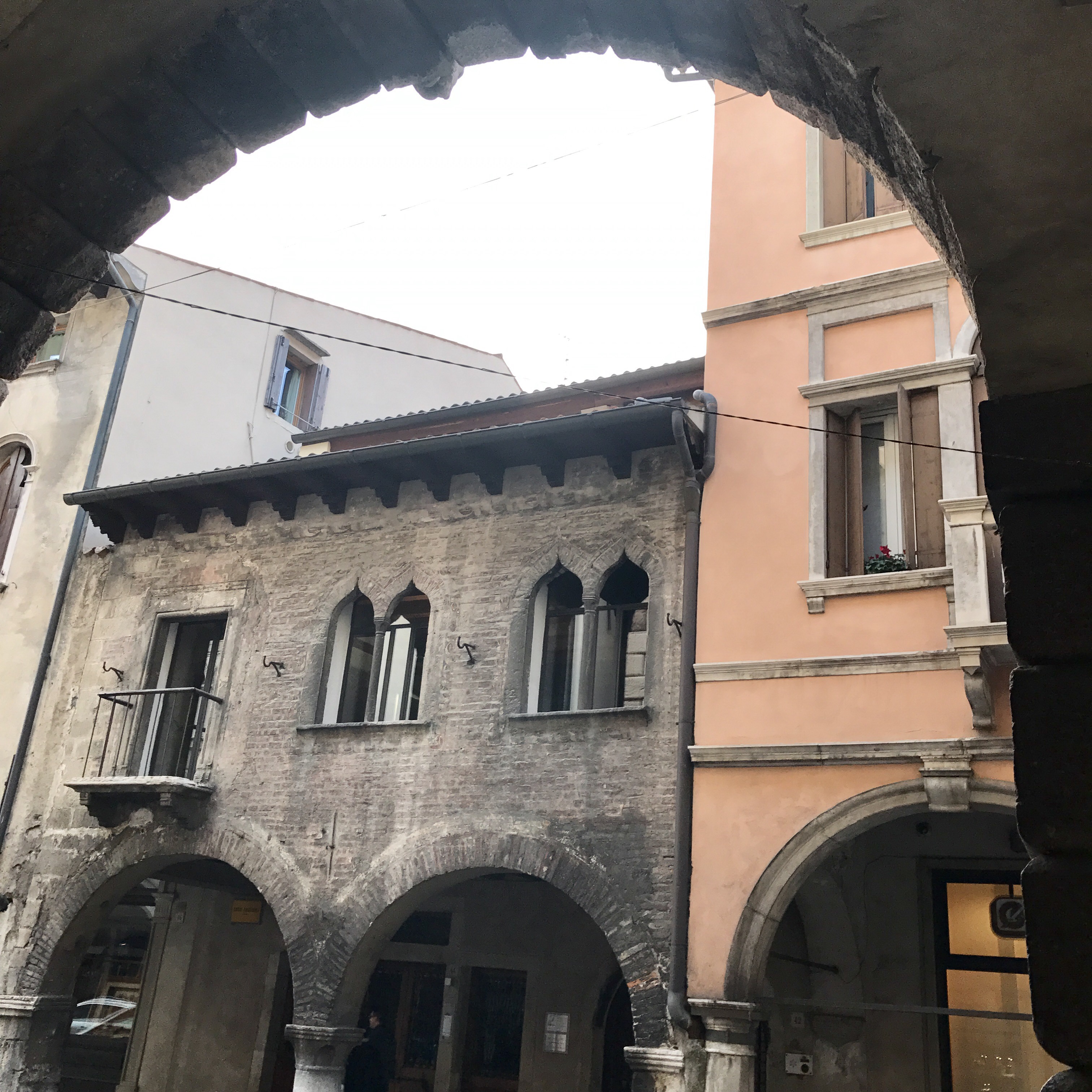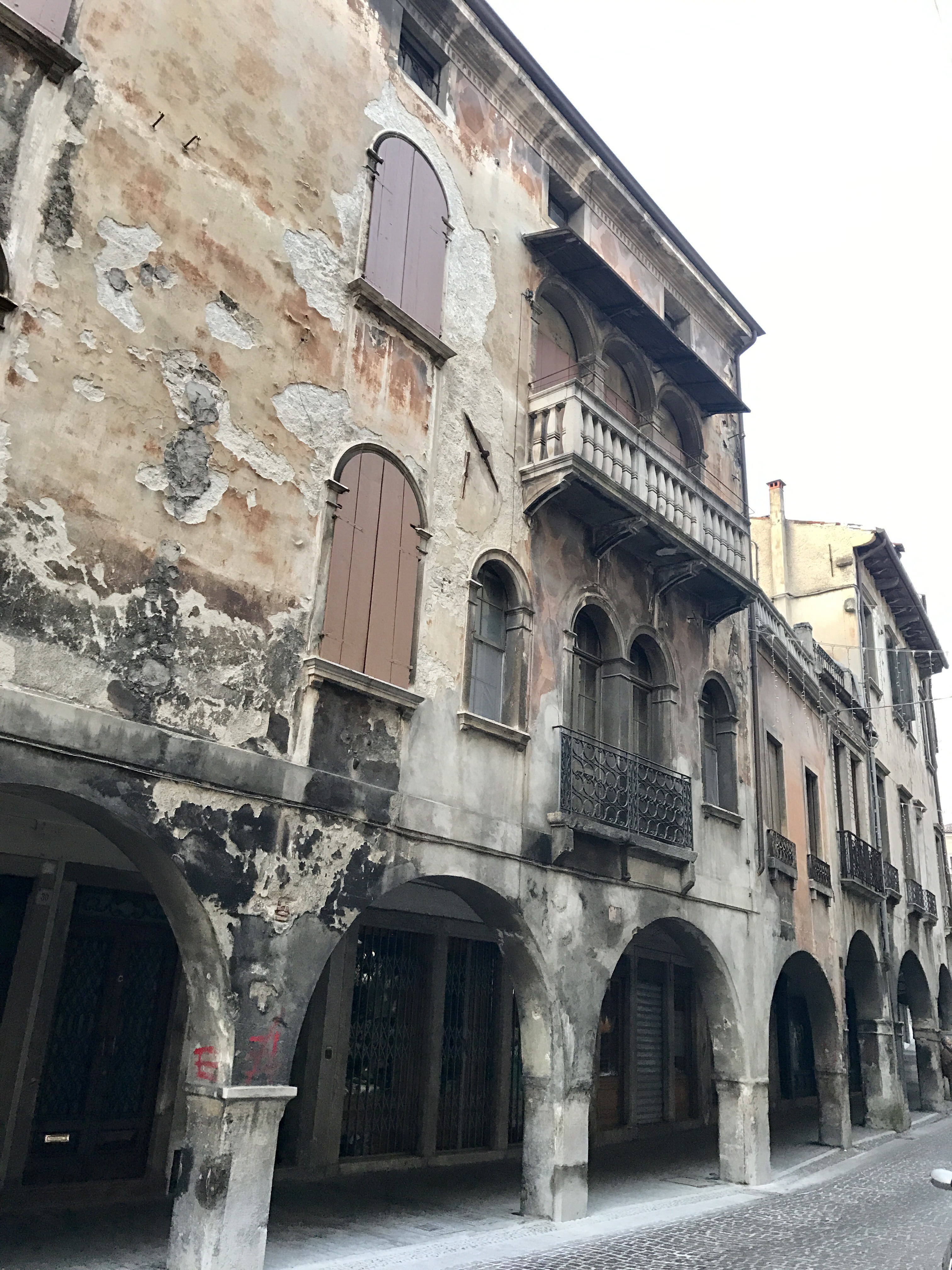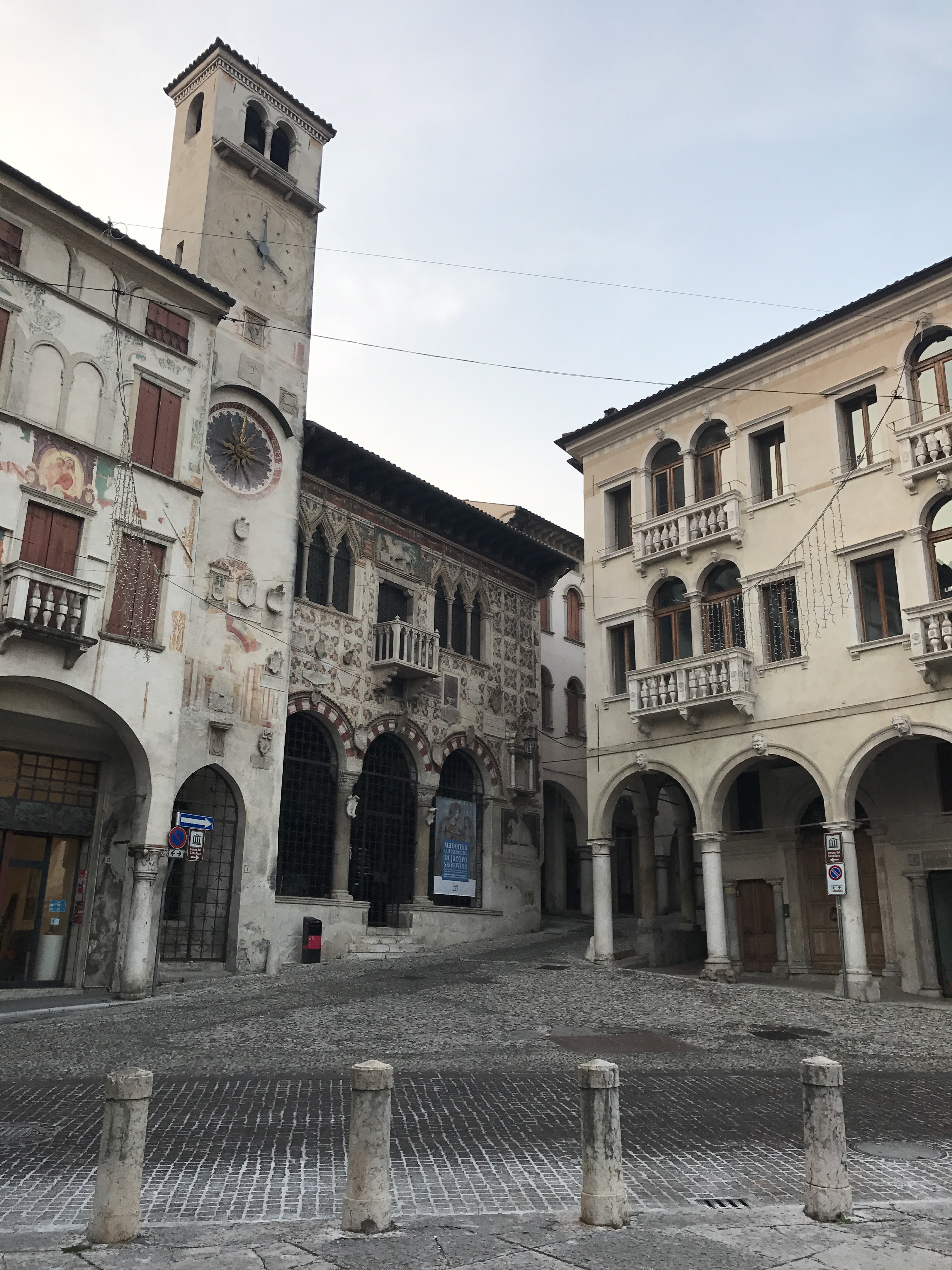 Serravalle, like Treviso, the regional center of the prosperous region of Veneto, features frescoes on the façades of buildings. This is something fascinating that I learned during this trip (from my mom, who is from Treviso) Frescoes in Serravalle- a town of Roman origin-were not just relegated to the interior of churches, but graced the buildings’ street elevations and were painted by notable local artists. Most of the palazzi date from the 1400’s. What was depicted on them? Hard to say from what remains in Serravalle. I could discern some courtly scenes  and patterns/coat of arms. Both here and in Treviso, the frescoes were plastered over during one of the bouts of the Plague, in a misguided effort to ‘disinfect’ homes.