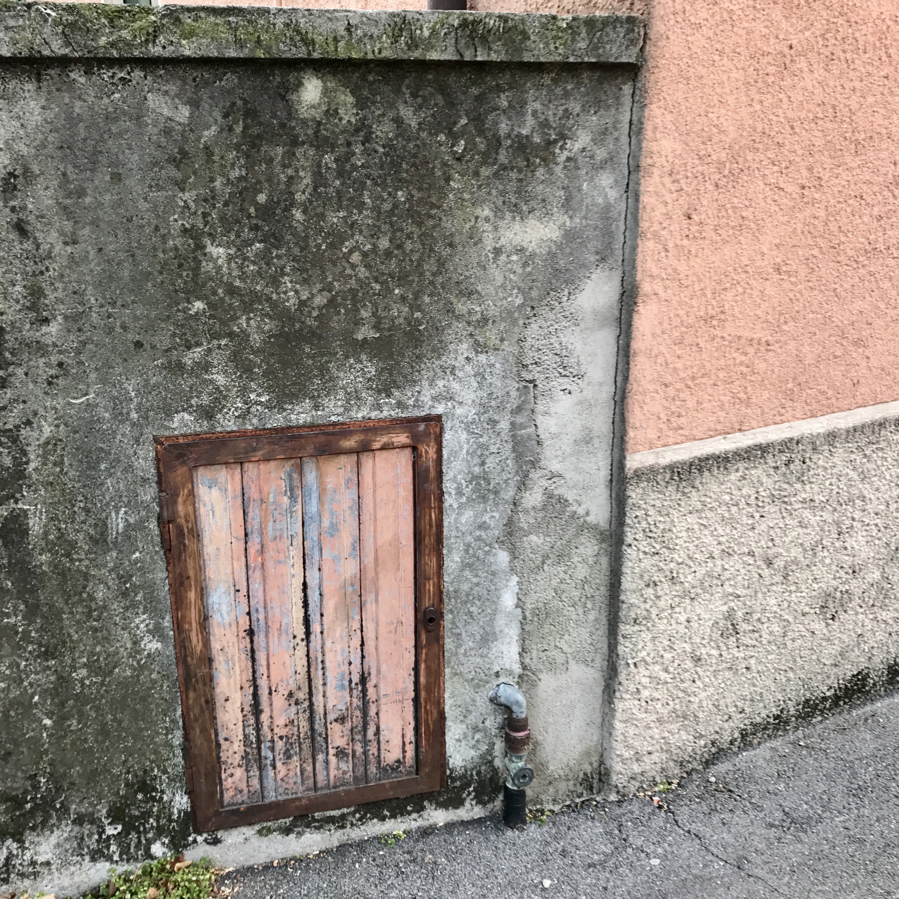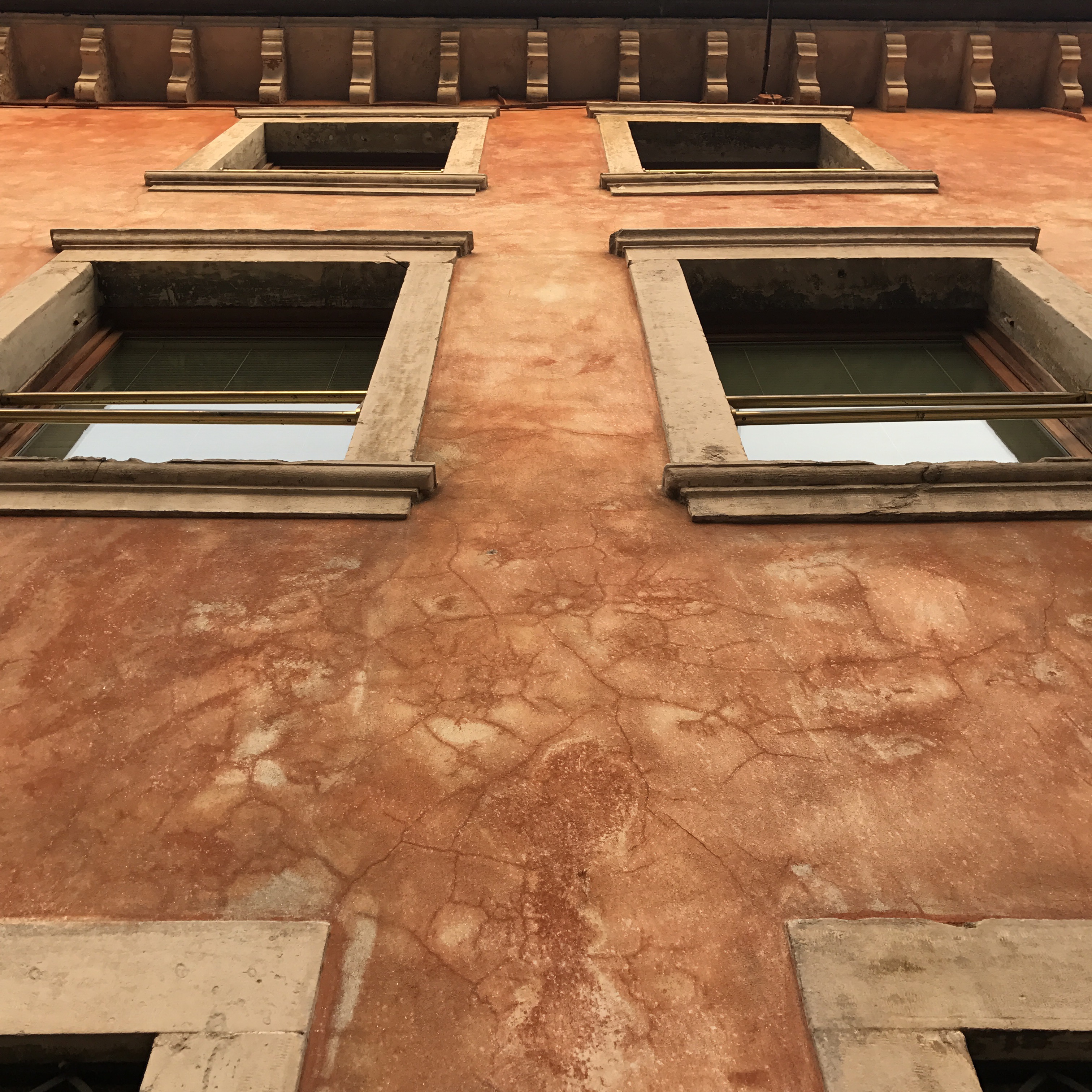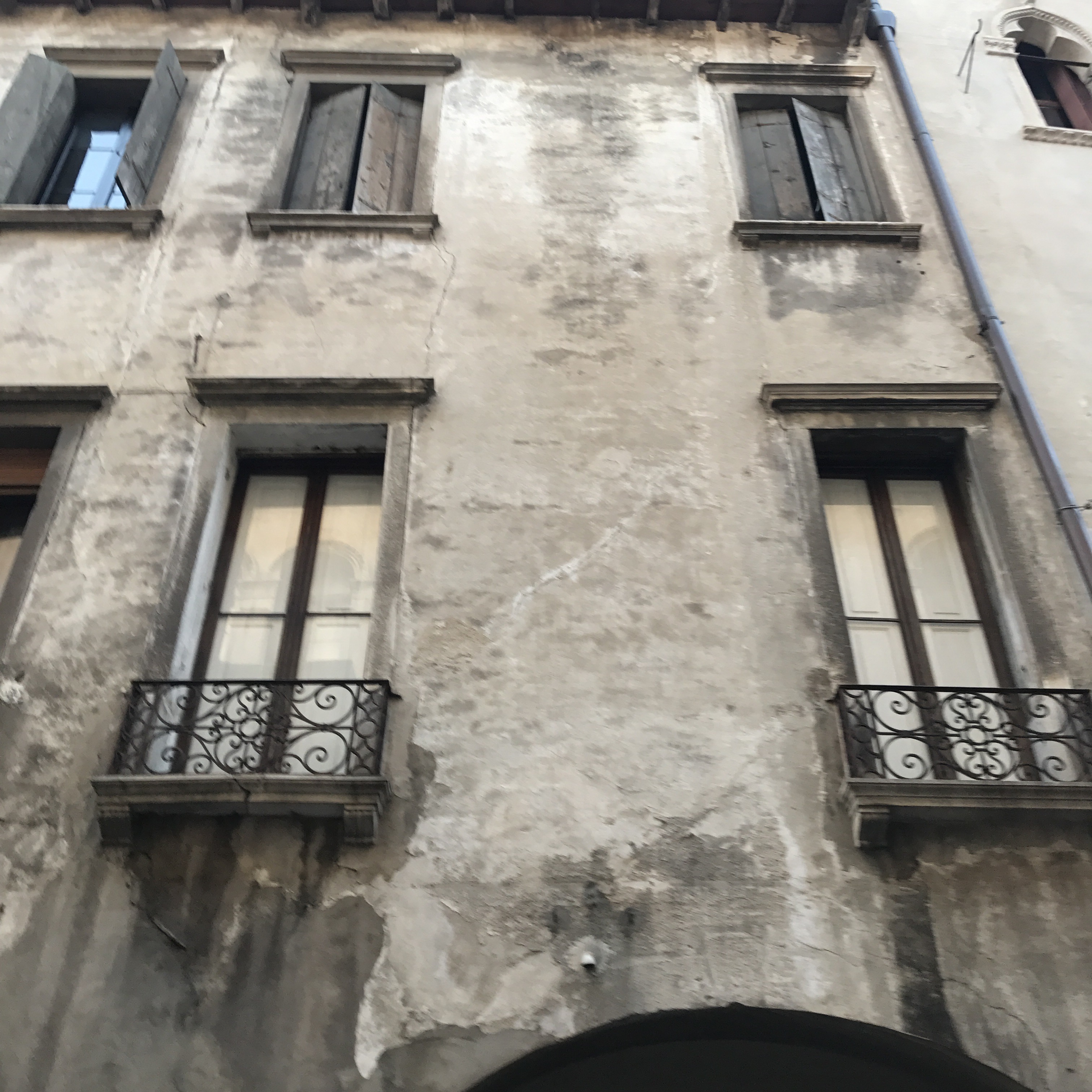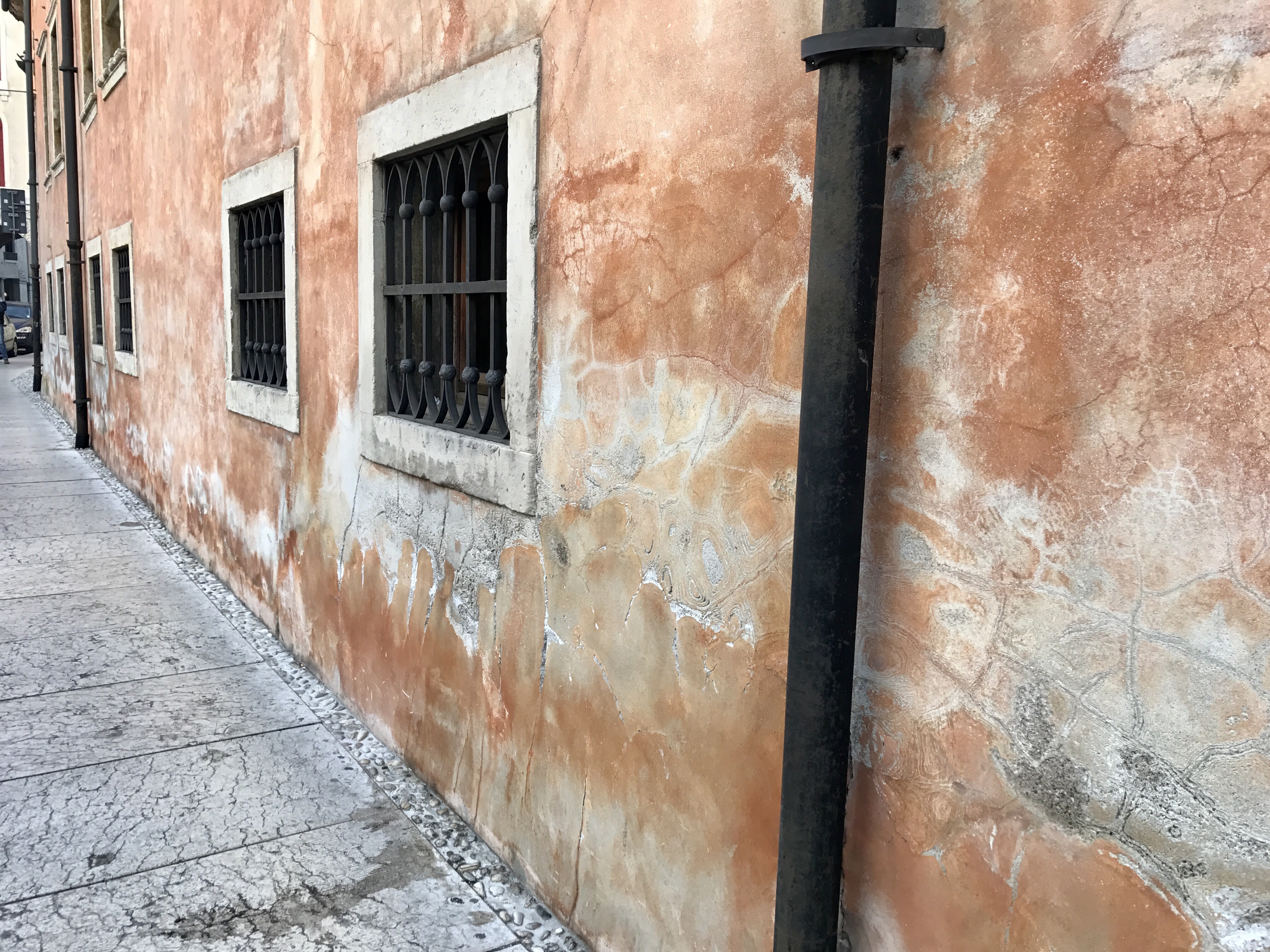 Serravalle, like Treviso, the regional center of the prosperous region of Veneto, features frescoes on the façades of buildings. This is something fascinating that I learned during this trip (from my mom, who is from Treviso) Frescoes in Serravalle- a town of Roman origin-were not just relegated to the interior of churches, but graced the buildings’ street elevations and were painted by notable local artists. Most of the palazzi date from the 1400’s. What was depicted on them? Hard to say from what remains in Serravalle. I could discern some courtly scenes  and patterns/coat of arms. Both here and in Treviso, the frescoes were plastered over during one of the bouts of the Plague, in a misguided effort to ‘disinfect’ homes.