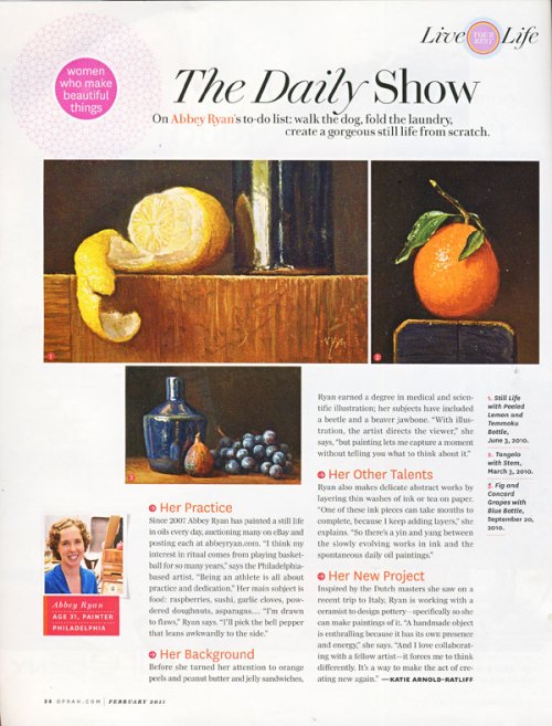 From Oprah's February Issue: the blog abbeyryan.com. She has posted an oil still life every day since 2007. WOW! Click to find Abbey.