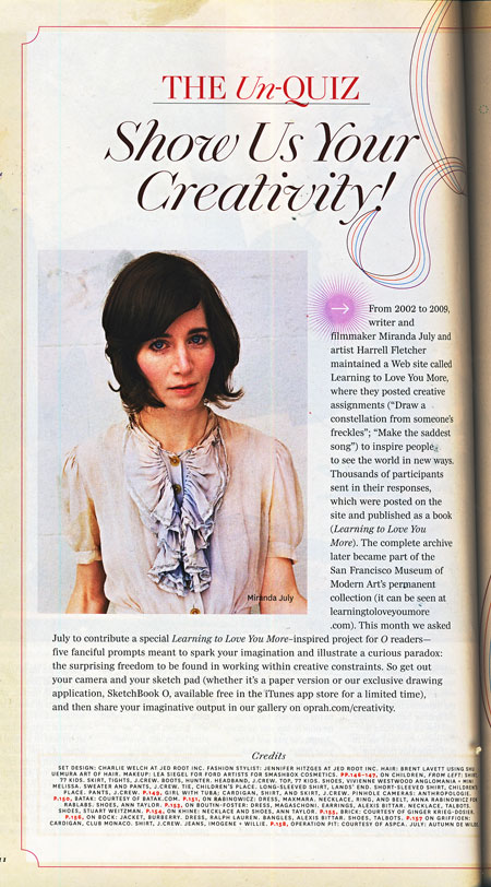 This is the un-quiz I am taking…designed by filmmaker Miranda July and Artist Harrell Fletcher, creators of the website Learning to Love You More. Click for creative assignments!