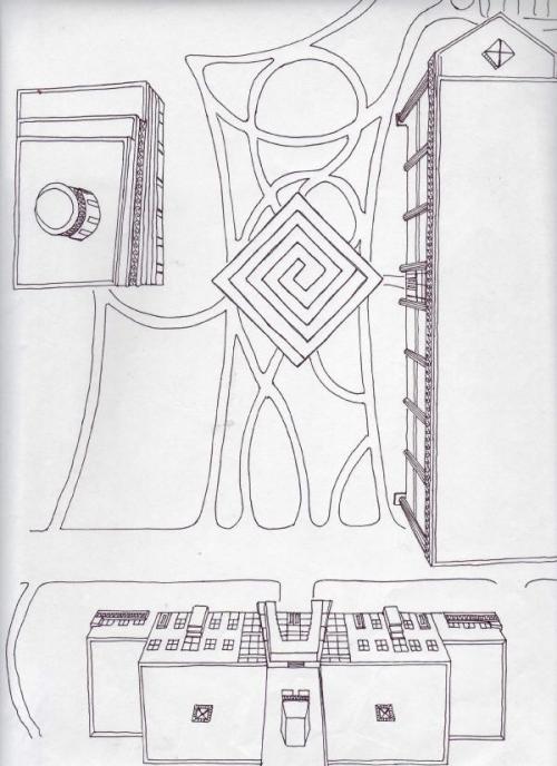 Southwestern college. One point perspective drawn by hand. Ink on paper. 2002
