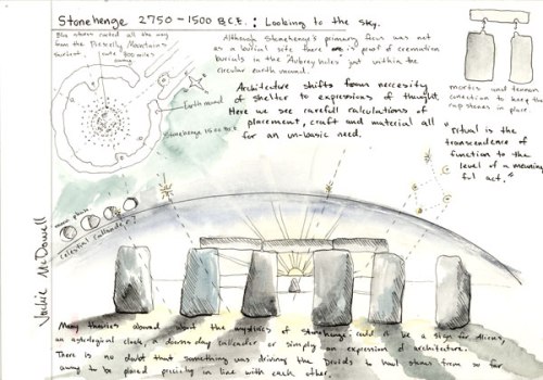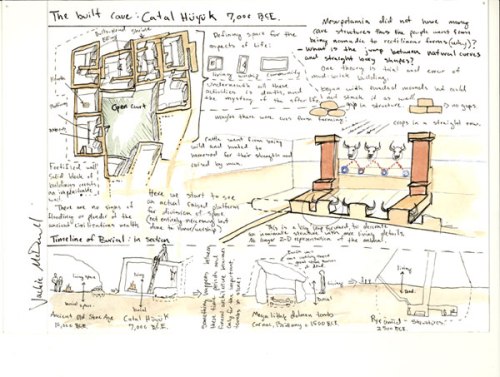 I am posting the first of a series of samples of student work from the exhibit  History of Architecture: Analysis and Synthesis Through Visual Notes. Moving chronologically, today we start with the Beginnings of Architecture.  This body work was completed for the Graduate History of Architecture sequence, comprising of three courses, which i taught during the 2011-2012 school year.