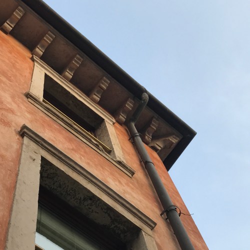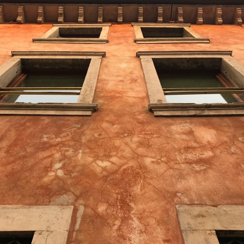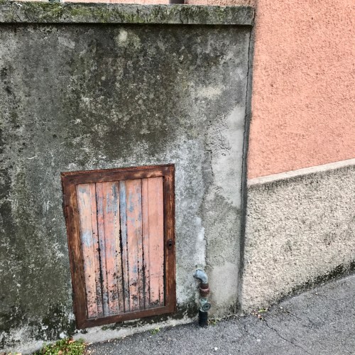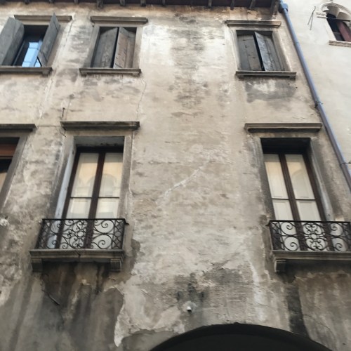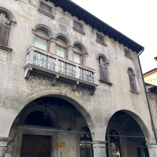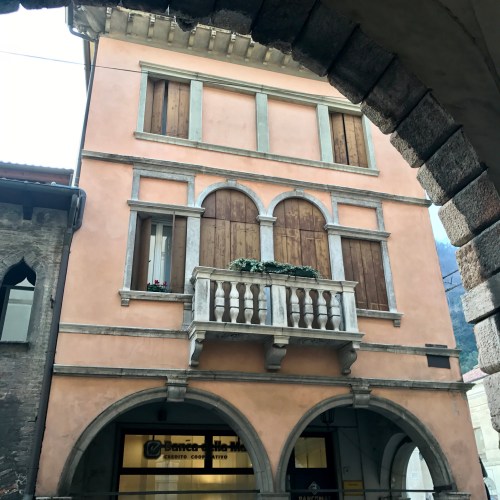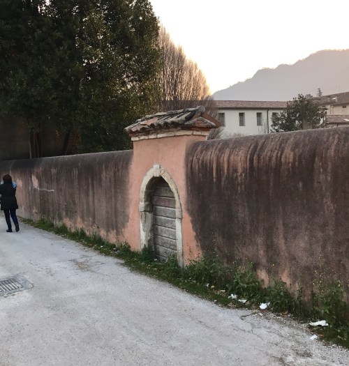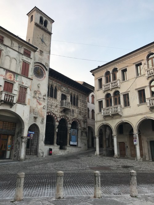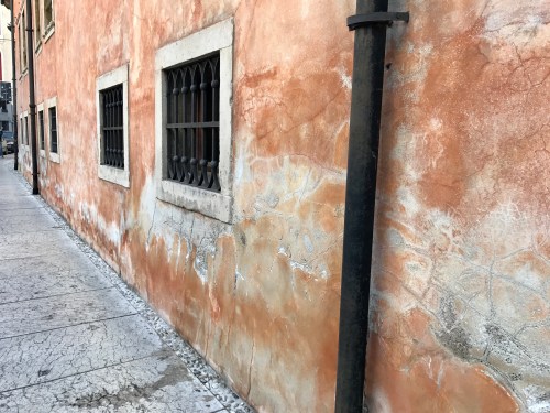 Serravalle, like Treviso, the regional center of the prosperous region of Veneto, features frescoes on the façades of buildings. This is something fascinating that I learned during this trip (from my mom, who is from Treviso) Frescoes in Serravalle- a town of Roman origin-were not just relegated to the interior of churches, but graced the buildings’ street elevations and were painted by notable local artists. Most of the palazzi date from the 1400’s. What was depicted on them? Hard to say from what remains in Serravalle. I could discern some courtly scenes and patterns/coat of arms. Both here and in Treviso, the frescoes were plastered over during one of the bouts of the Plague, in a misguided effort to ‘disinfect’ homes.