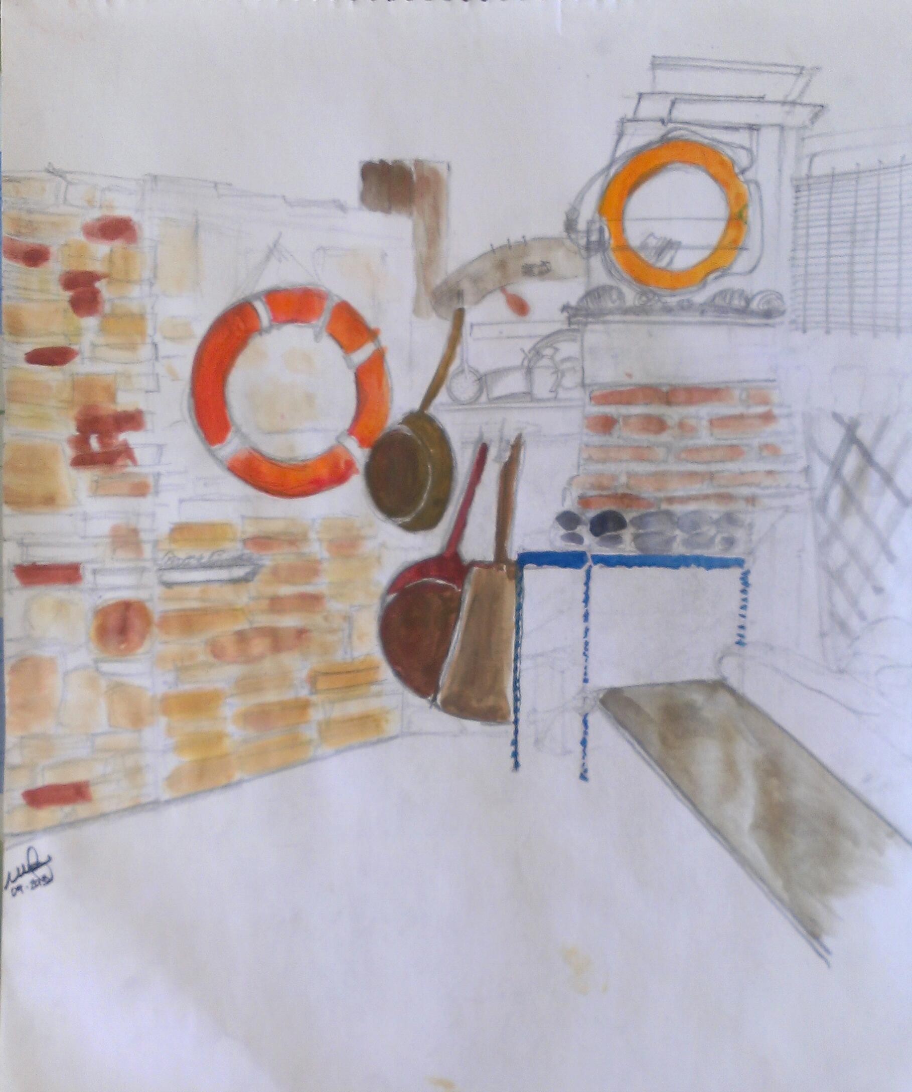 La Baracca del Bucaniere - Fisherman's Shack - The Kitchen. Graphite and watercolor. Calabria, Italia. September 18, 2013.